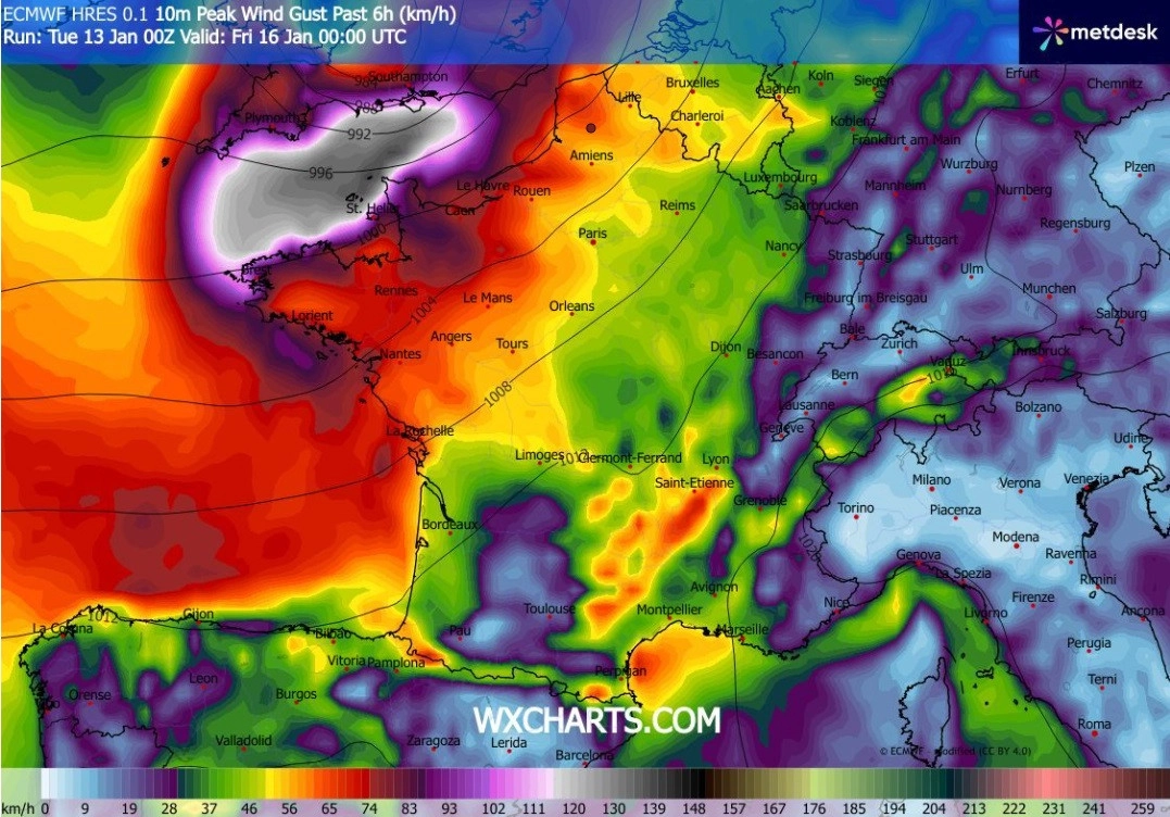 En soirée, la tempête atteindra son apogée : le vent dépassera les 80 km/h à la pointe nord-ouest, 66 à 62 km/h dans le nord du département, et 54-57 km/h jusqu’au centre de la région. Les rafales ne baisseront que très lentement en deuxième partie de nuit.